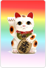In Japan häufig vorzufindendes Glückssymbol. Die Winkekatze steht dort in Restaurants, Geschäften oder Pachinko-Hallen. Die rechte zum Winken erhobene Katze zieht Geld an, die linke Kunden.